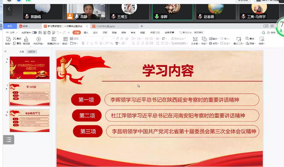 李晖同志和杜江萍同志分别领学习近平总书记在陕西延安和河南安阳考察时的重要讲话精神。习近平总书记深入陕西延安市和河南安阳市的农村、公司、红色教育基地、文物保护单位等进行调研与考察。在考察中总书记特别强调全面建设社会主义现代化国家,最艰巨最繁重的任务仍然在农村。要全面学习贯彻党的二十大精神,坚持农业农村优先发展;通过文物发掘、研究保护工作,才能更好地传承优秀传统文化,增强中国人民的家国情怀。