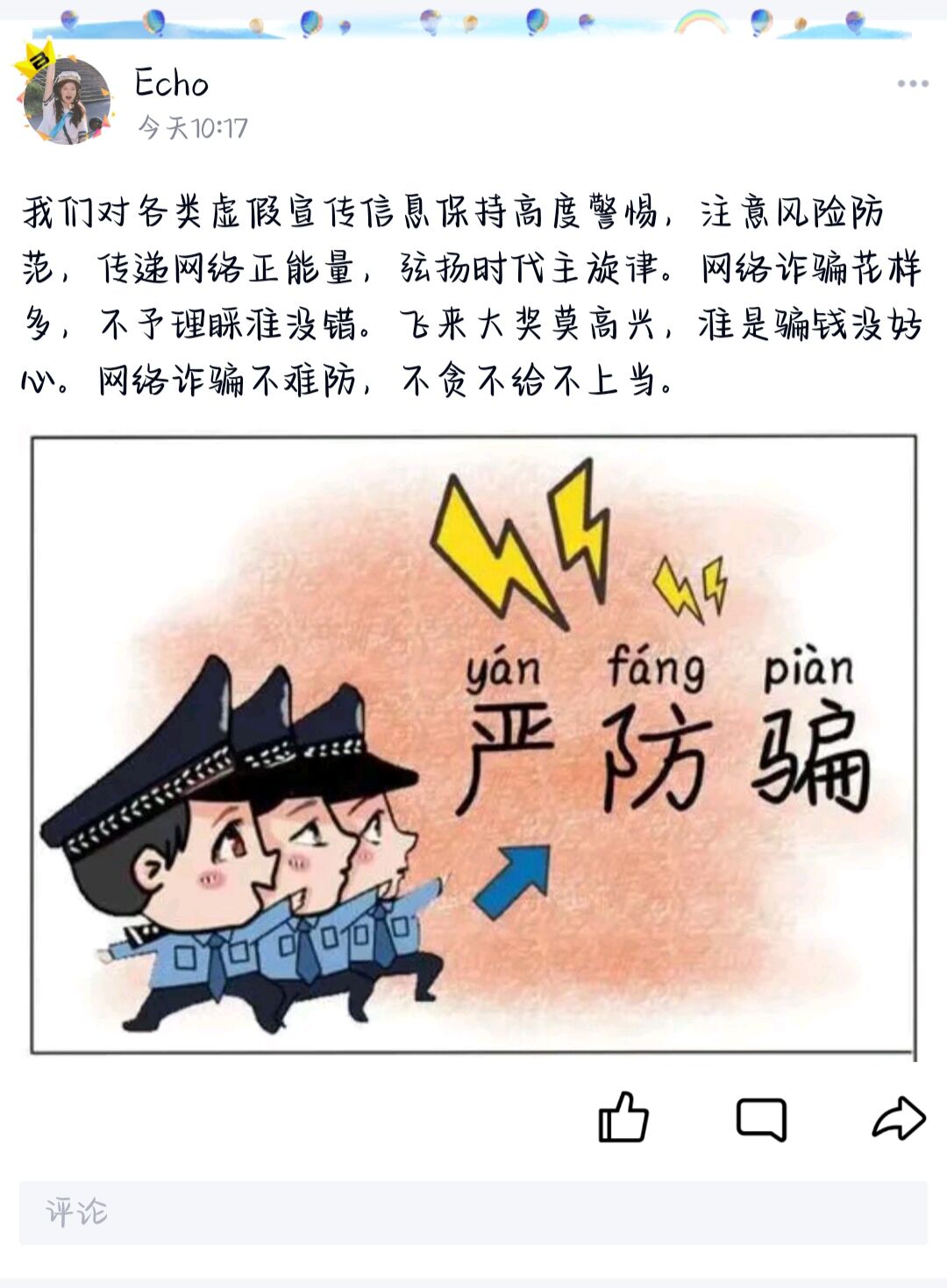 此次的志愿者活动,参与的志愿者同学在进行宣传转发的过程中深切体会到防诈骗的重要性并对如何识骗、防骗有了更深刻的了解,增强了老员工防骗的法律意识,为守护共同安全起到了良好的促进作用。